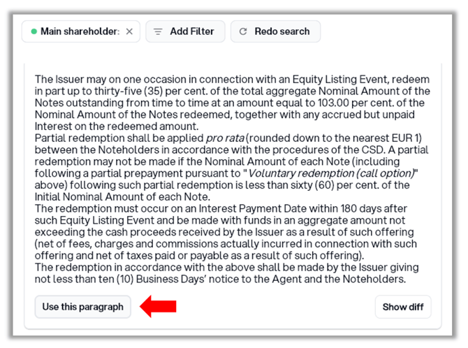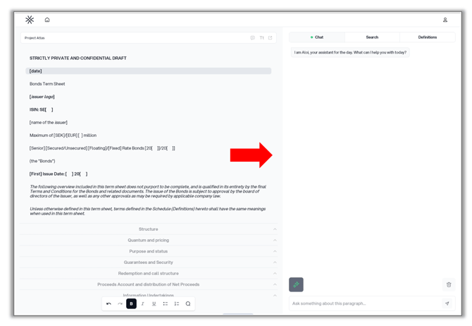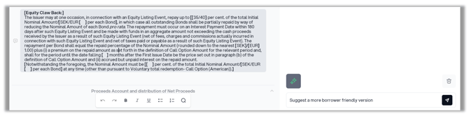 Aloi can give you suggestions and insights, and help you create new clauses or edit existing clauses. You can also ask follow-up questions, in a similar fashion to how you discuss a matter with a colleauge. To do this, mark a paragraph and write a prompt in the chat.